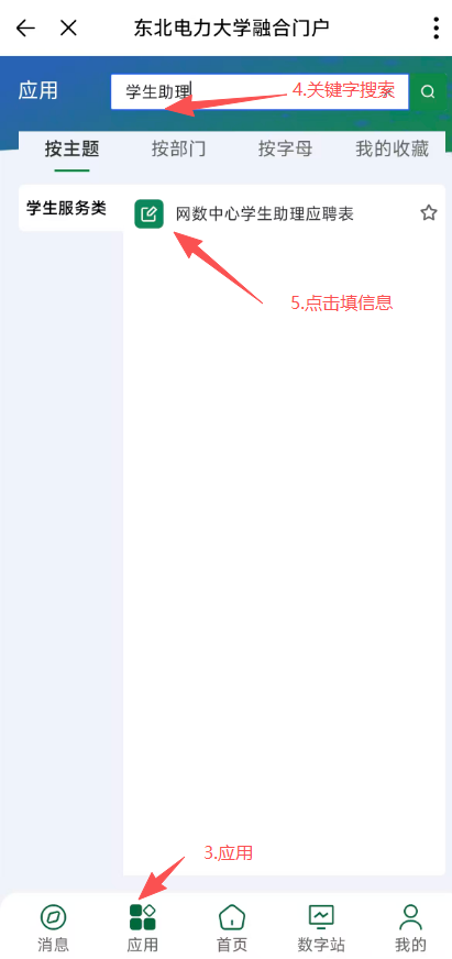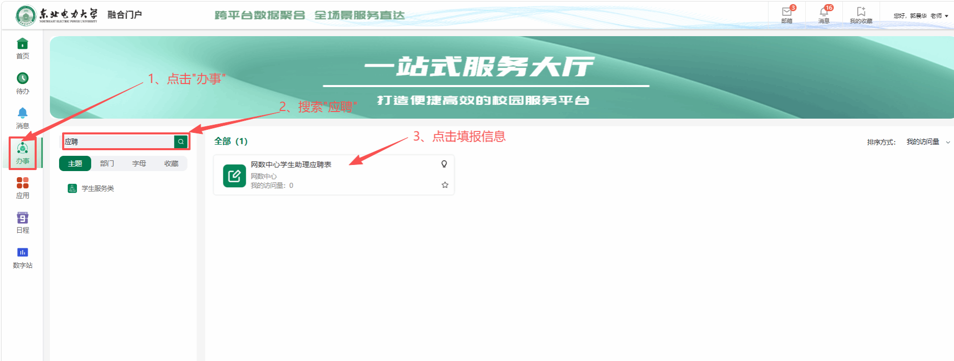 有意报名的同学请通过融合门户”--“办事”--“网数中心学生助理应聘”,填写完整信息并提交。