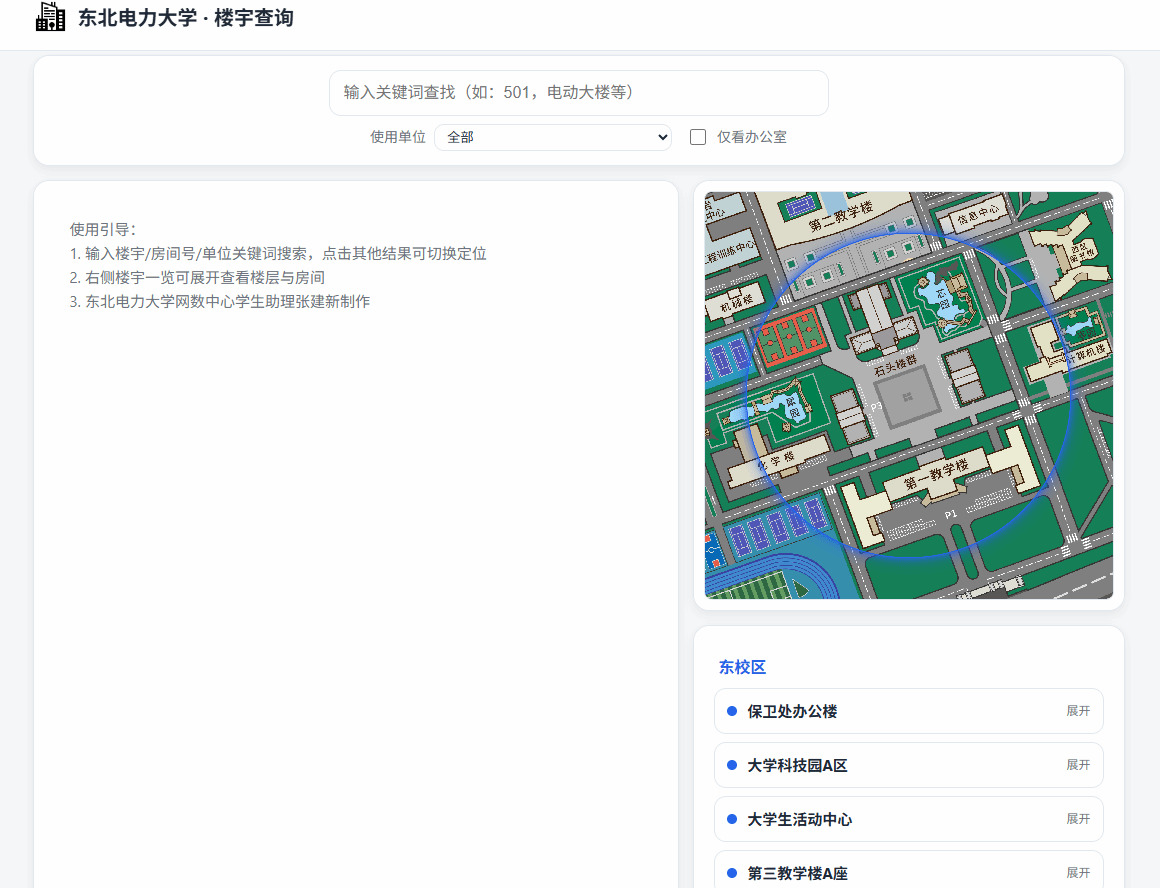 (2)校园楼宇查询系统:“东北电力大学·楼宇查询”是一款轻量化校园服务网站,整合楼宇、房间、单位及地图定位,支持搜索、筛选、楼层查看与地图联动,方便快速找楼、找教室、找办公室。网站已收录2000余条房间数据,覆盖东西校区及部分校外点位,适配手机端,是面向真实需求的校园数字化工具。